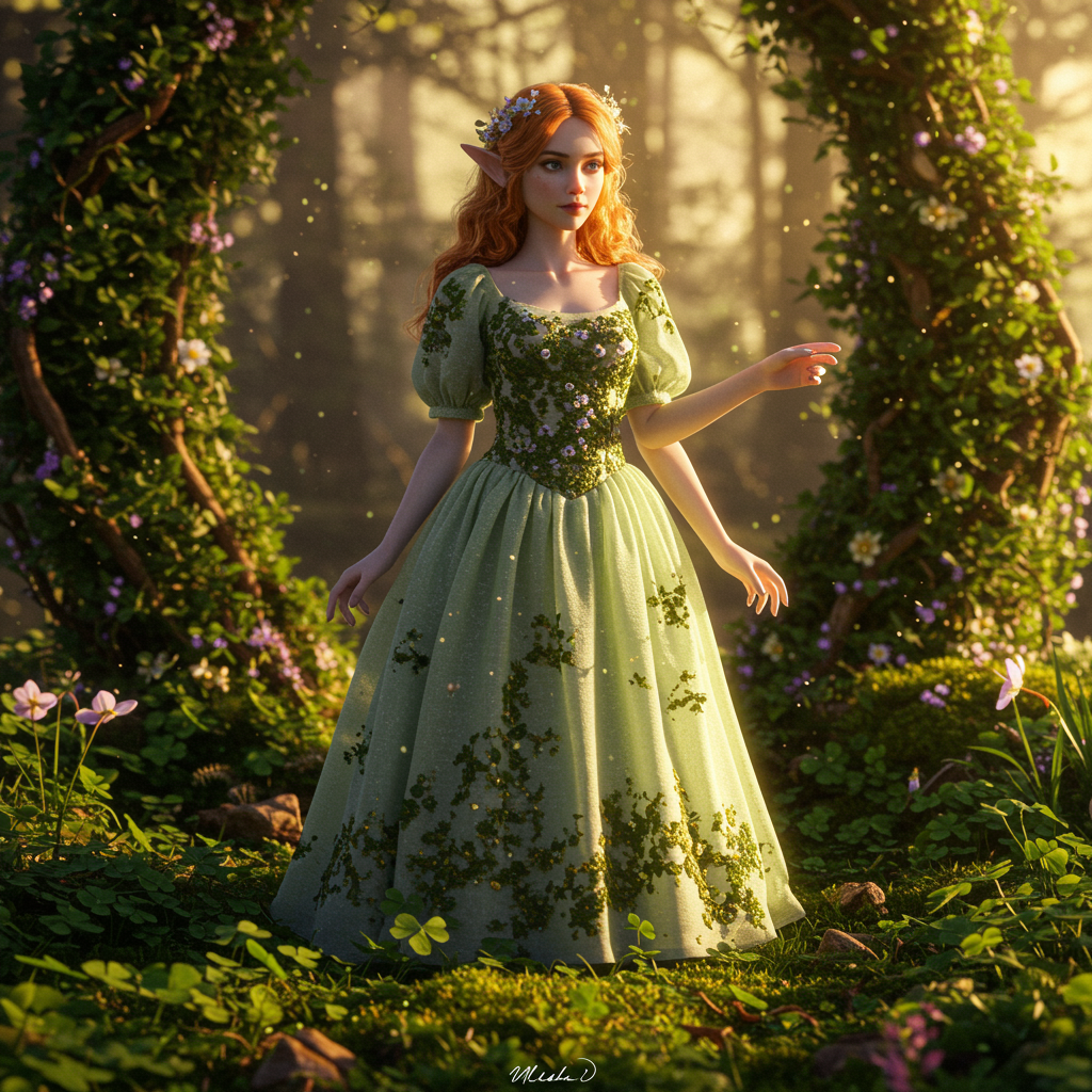 Wearing an enchanting gown amidst moss, flowers, and clovers, the scene is bathed in warm sunlight, creating a dreamy and intricate atmosphere. The image is highly detailed with sharp focus and is professionally color graded, resembling a masterpiece trending on artstation. Presented in HDR 4K and 8K quality, it features an artistic depth of field with high contrast, f/1.8. The style combines elements of both cartoon and comic, yet avoids disfigurement or poor art. Every detail is meticulously rendered, focusing on accurate anatomy and well-drawn hands, avoiding any visual errors, distortions, or unnecessary text or markings.