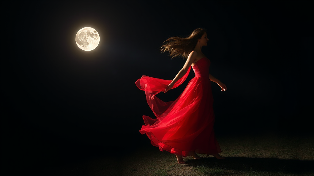 Wearing my crimson gown tonight, twirling in the shadows under the silver moonbeam, hair swept up like a pageant star, bare feet touching the earth, feeling vibrant, gown like a wisp of scarlet mist.