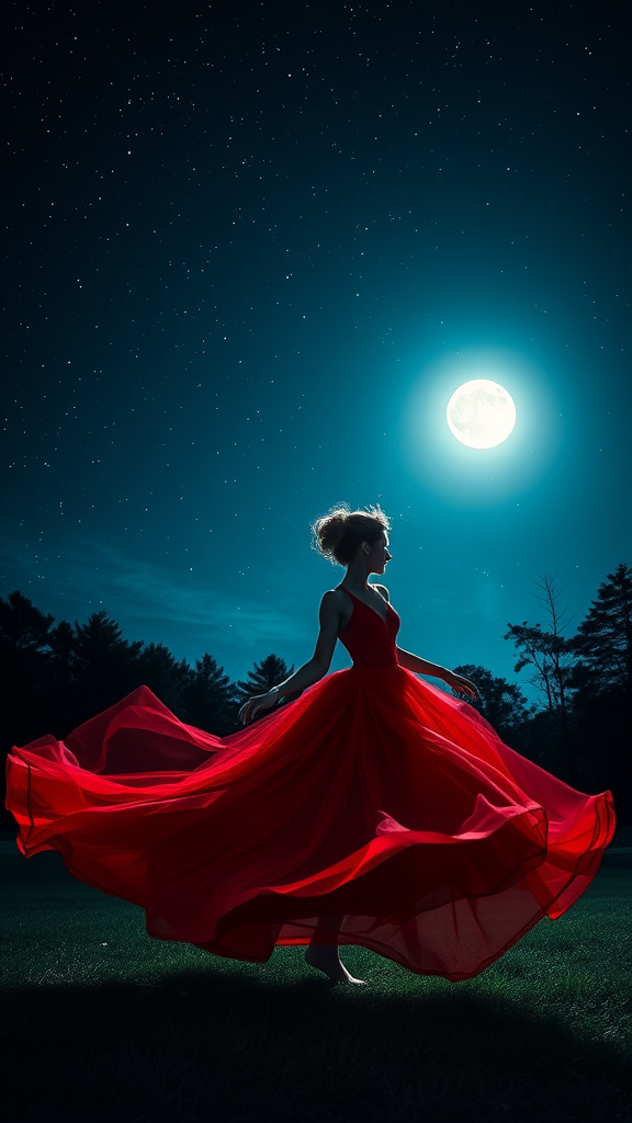 Wearing my crimson gown under the starry sky, twirling gracefully in the dim glow of the moon, my hair styled high like a regal crown, barefoot and electrified, my dress swirling like wisps of scarlet mist.
