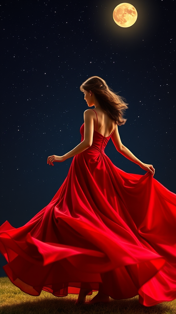 Wearing my crimson gown under the stars, twirling under the gentle glow of the moon, my hair elegantly styled in a regal manner, barefoot and brimming with vitality, crimson dress swirling like wisps of smoke.