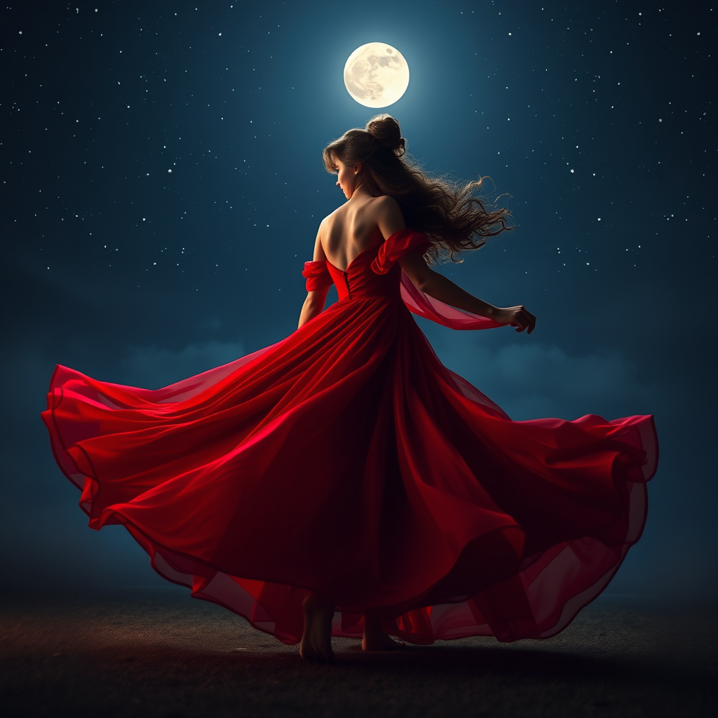Wearing my scarlet gown under the starlit sky, twirling gracefully in the dim glow of the moon, hair piled high in glamorous waves, barefoot and electrified, crimson fabric swirling like misty whispers.