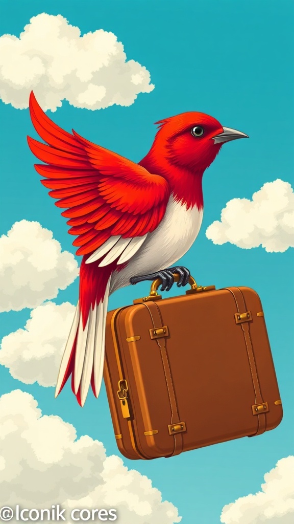 View this AI-generated image featuring a logo for a travel website featuring a scarlet bird with ivory wings clutching a vintage suitcase set against a cerulean sky dotted with fluffy white clouds the design is reminiscent of beatrix potter s intricate illustrations with a cottage core aesthetic ren