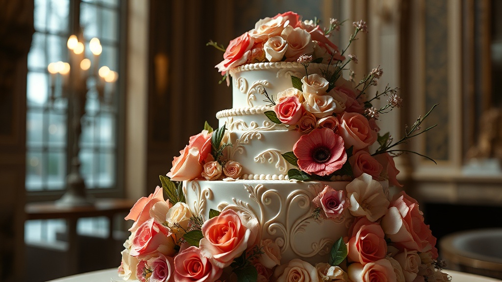 Wedding cake that appears deceptively as a luxurious art sculpture | Elaborate details | Lush edible florals | Sophisticated elegance | Digital artwork | Hyper-realistic | High contrast | Gentle shadows | Three-quarter perspective | Intricate textures | Vibrant hues | Depth of field | Ambient light play | Subtle imperfections | Artistic expression