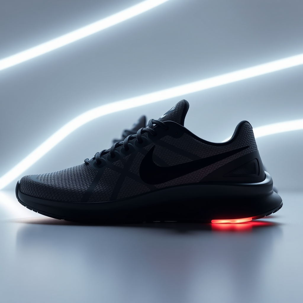 Well-illuminated Nike pace shoes crafted from advanced rubber and composite fibers, featuring a sleek black Nike logo on the side; photography inspired by Steven Meisel with exquisite lighting design, soft indirect shadows; rendered with Unreal Engine and Octane Render for a high-definition, ultra-realistic finish, image resolution at an impeccable IQ of 180, aspect ratio of 2:3, quality level set at 2.
