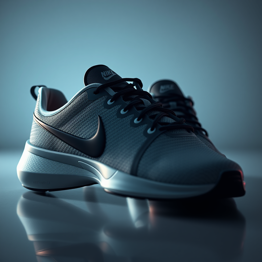 Well illuminated Nike pace sneakers crafted from high-quality rubber and advanced composite fibers, featuring a sleek black Nike logo. Captured with the artistic vision of Steven Meisel, showcasing exquisite lighting with subtle indirect highlights, rendered using the power of Unreal Engine and Octane Render for a high-definition, ultra-realistic finish, IQ 180, aspect ratio 2:3, quality level 2.
