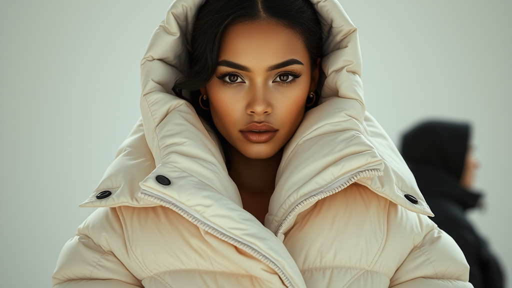 Well-lit fashion portrait of a stunning female model wrapped in an oversized puffer jacket designed by top brands like Craig Green, Dingyun Zhang, Yeezy, Balenciaga, and Vetements. The image is sharply focused, incredibly detailed, and has a cinematic allure. The shoot exudes a glamorous, symmetrical vibe, reminiscent of high-end Vogue editorials. It's a glossy fashion magazine spread, with an off-white color palette and polished, sophisticated styling.