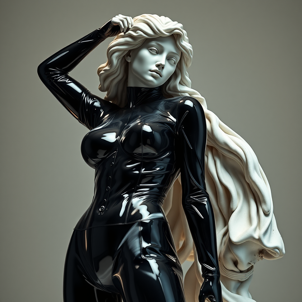 Well-lit fashion shoot of an exquisitely beautiful female marble statue in a dynamic pose, adorned in a striking latex ensemble by Dingyun Zhang, Yeezy, Balenciaga, Vetements, A-Cold-Wall. Sharp focus and clarity highlight intricate details in a cinematic and glossy style. The composition exudes glamour, symmetry, and an editorial essence, reminiscent of a high-fashion magazine spread. The portrayal is contemporary and visually captivating, infused with luxury and modern design nuances.