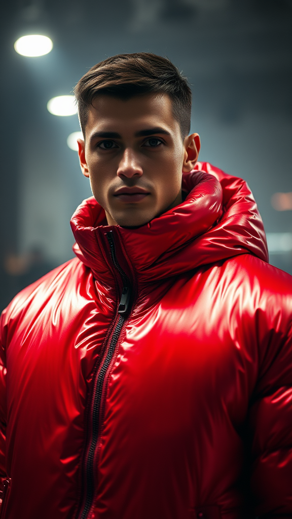 Well-lit fashion shoot portrait of a striking man in a metallic crimson inflatable oversized bubble puffer jacket by Yeezy and Balenciaga, sharp focus, vivid, detailed, cinematic, elegant, balanced, gentle lighting, diffuse lighting, high-fashion, editorial, magazine-style photography.