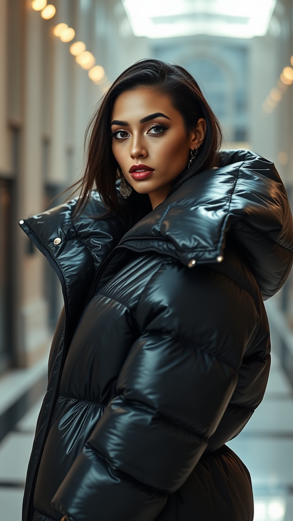 Well-lit fashion shoot portrait of an exceptionally stunning female model wearing a dramatically oversized puffer jacket designed by Craig Green and Dingyun Zhang, Yeezy, Balenciaga, Vetements. The image is in sharp focus with clear, intricate details, offering a cinematic, lavish feel. The theme is glamorous and symmetrical, reminiscent of a Vogue editorial. The glossy finish enhances the fashion magazine shoot vibe with creative touches of Off-White aesthetics.