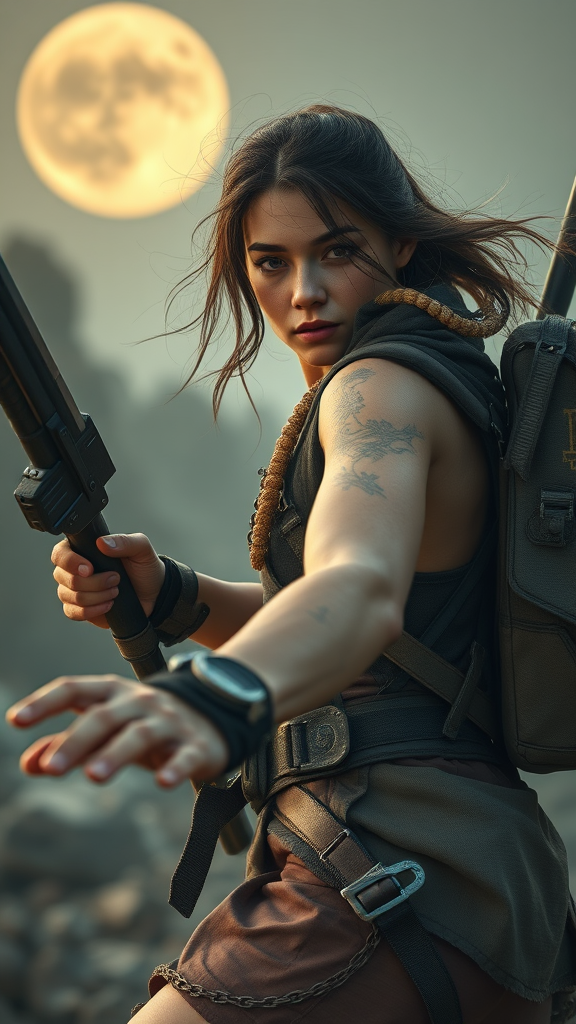 Weronika Rosati as a dynamic adventurer, full body portrait, hyper detailed action scene, ultra photorealistic muted tones, photorealism, grand composition Unreal Engine, expert color grading, ultra wide angle, depth of field, hyper detailed, rich colors, intricate elements, Unreal Engine cinematic feel, editorial photography with studio finesse, photo shoot ambiance, DOF, Tilt Blur, White Balance, 32k, Super Resolution capture, maximum megapixels, ProPhoto RGB, evocative Half Moon Lighting, Backlighting, soft Daylighting, Incandescent glow, Ambient Lighting sophistication, Cinematic Lighting artistry, Studio Lighting refinement, soft lighting nuances, photorealistic quality, volumetric depth, accent lighting precision, global illumination mastery, immersive global illumination in Screen Space, Ray Traced Global Illumination finesse, Optics clarity, Scattering effects, Optimal Brightness, deep Shadows, Surface Roughness, Glare management, Ray Tracing Reflections with finesse, Lumen Reflections depth, Screen Space Reflections clarity, Diffraction Gradient subtleties, Chromatic Aberration touches, GB Displacement detail, Scan Line dynamics, Ray Tracing enhancement, Ray Tracing Ambient Occlusion richness, Anti-Aliasing definition, FKAA, TXAA, RTX realism, SSAO depth, Shaders intricacy, OpenGL-Shaders fluidity, GLSL-Shaders integration, Polished Post Processing, including Post Production mastery, Cel Shading hint, Tone Mapping precision, CGI allure, VFX impact, SFX enhancement, incredibly detailed and intricate with maximalist style, elegance, hyper realism, super detailed motion, dynamic posing, portrait photography 8k, --ar 9:16 --q 3 --v 4.