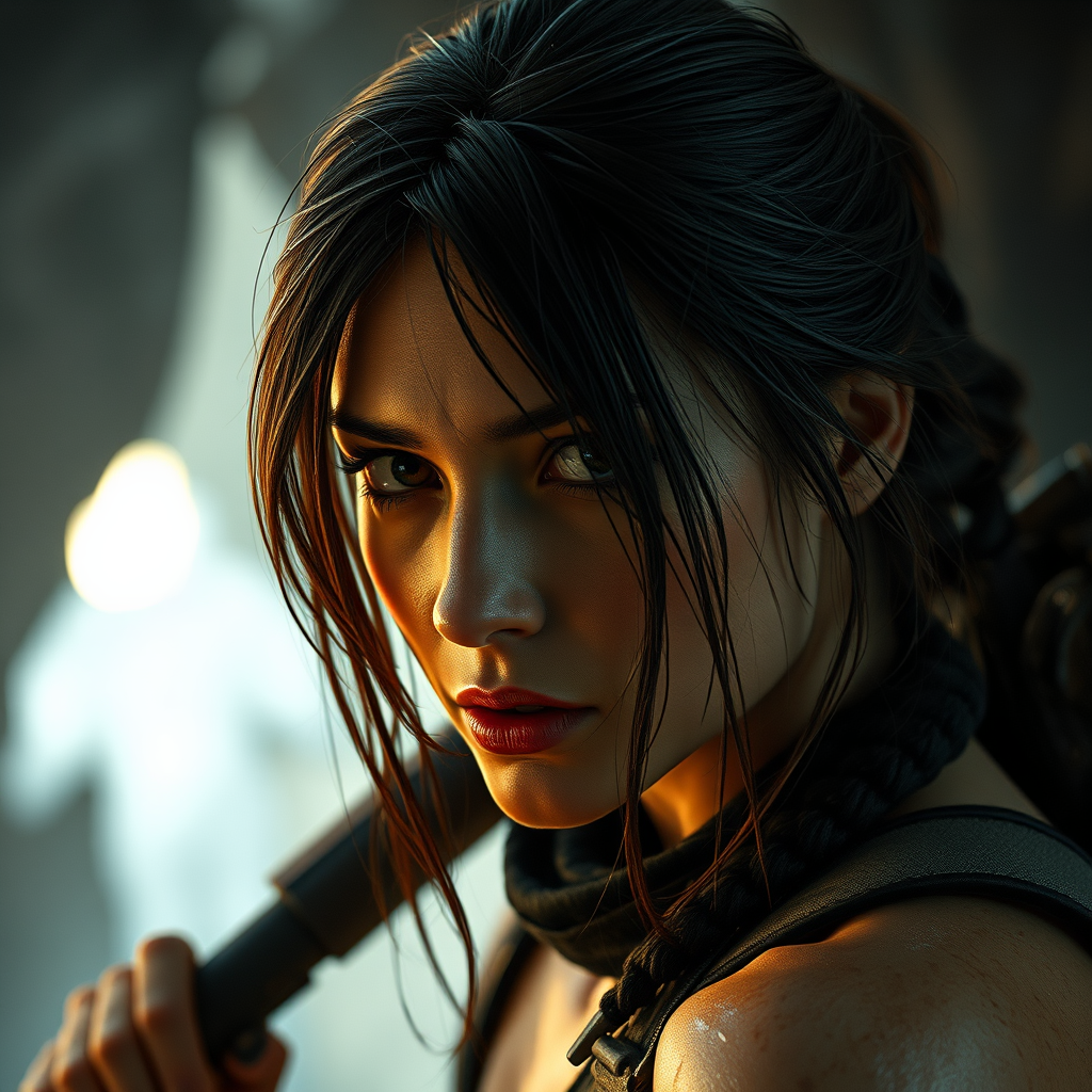 Weronika Rosati as Lara Croft, full body portrait in a hyper-detailed dynamic scene. Ultra-photorealistic with muted tones, showcasing an epic composition akin to Unreal Engine visuals. Detailed color grading and an ultra wide angle enhance the scene's depth of field. Capturing crazy and intricate details, this cinematic shot blends photography and photorealistic elements. Lighting varies from half moon to backlighting and daylight, with incandescent and ambient lighting completing the look. The scene features studio and cinematic soft lighting, enhanced by volumetric and global illumination effects. Optical elements include ray-traced global illumination, reflections, and shadows, with an emphasis on scattering and glare reduction. Screen space and ray tracing reflections add depth, complemented by diffraction gradation and chromatic aberration effects. Imaging techniques such as GB displacement, scan lines, and advanced post-processing enhance the hyper-realism. The image combines OpenGL and GLSL shaders with tone mapping and CGI elements for maximum detail. This VFX-rich portrait showcases Weronika in a dynamic pose, captured in a super-detailed 8k resolution, maintaining the essence of a hyper-maximalist, elegant, photographic style.