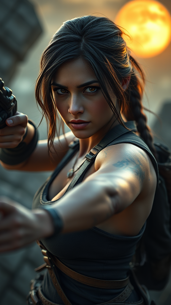 Weronika Rosati as Lara Croft in an action-packed, full-body portrait, showcasing intricate, hyper-realistic details in a dynamic, epic scene. The image features ultra-muted colors with cinematic composition created in Unreal Engine. Exceptional color grading is employed, combining ultra-wide angle depth of field, accentuated by hyper-detailed textures and vivid colors. The setting is beautifully lit, incorporating environmental effects like Half Moon Lighting, Backlighting, and Ambient Lighting to create a photorealistic atmosphere. The photograph features advanced techniques such as volumetric lighting, global illumination, and screen space reflections. Shadows, brightness, and glare are expertly rendered with cutting-edge technology, including Ray Traced Global Illumination and Lumen Reflections. The piece benefits from Anti-Aliasing methods like FKAA and TXAA, utilizing high-end RTX and SSAO, alongside GLSL-Shaders to enhance visual fidelity. The post-processed image reaches a super detailed, 32k resolution, delivering a cinematic vignette of elegance and hyper-realism. The composition captures an intricate, dynamic pose, perfectly echoing the essence of Lara Croft with creative, maximalist flair.