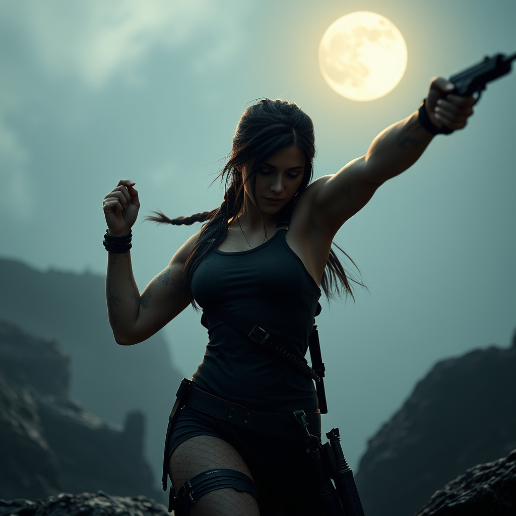 Weronika Rosati embodying Lara Croft, full body dynamic portrait set in an ultra-realistic scene with muted colors, the composition is epic and photorealistic. Captured using Unreal Engine, with meticulous color grading and a dramatic ultra-wide angle that enhances depth of field. The scene is hyper-detailed, with intricately colored elements and a cinematic touch. The lighting is a sophisticated mix of ambient, half-moon, and soft studio lighting that emphasizes volumetric and accent effects. Global illumination techniques are leveraged with screen space and ray-traced reflections creating realistic shadows, glare, and roughness. Advanced post-processing includes ray tracing, ambient occlusion, and shaders for a flawless finish. The portrayal is a super realistic, elegantly detailed visual with a dynamic pose captured in 8k quality, evoking an editorial photography style.