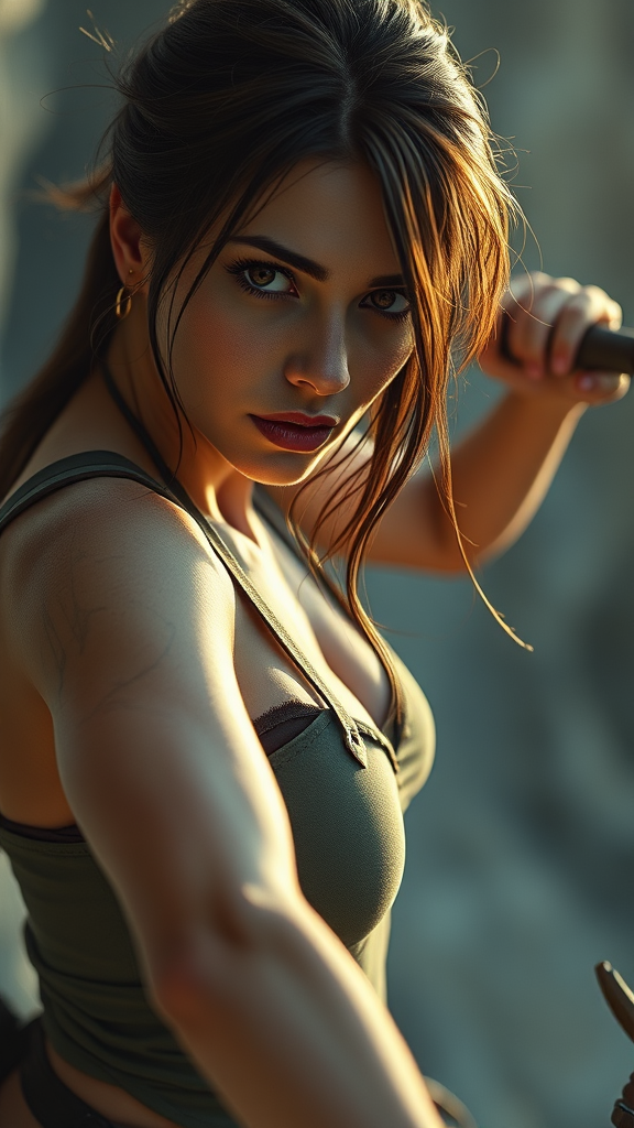 Weronika Rosati embodying Lara Croft in an ultra-detailed full-body portrait, captured dynamically in a hyper-realistic, muted color scheme. The scene is composed epically using Unreal Engine for a cinematic, editorial photography feel. Utilizing ultra wide-angle, depth of field, and tilt blur techniques, the image is meticulously color-graded with a focus on white balance and lighting effects like half moon, backlighting, and ambient lighting. Accentuated by photorealistic volumetric and global illumination effects, ray tracing reflections and shadows enhance the intricacy. Details are highlighted using techniques like chromatic aberration, diffraction gradation, and screen space reflections. This hyper-realistic portrayal is crafted with the aid of high-end CGI, VFX, and post-production processes, ensuring a super detailed image with an elegant and dynamic pose, perfectly suited for 8k portrait photography.