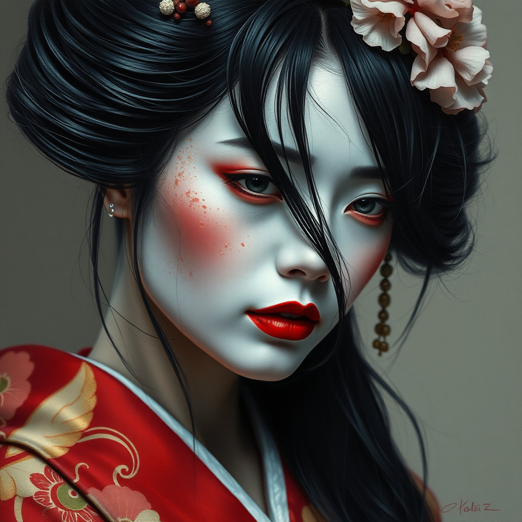Wet paint portrait of a Japanese geisha with jet-black hair, displaying a melancholy expression, adorned in a floral kimono with subtle battle scars on her face, hyper-maximalist, refined, exquisitely detailed, captured with extreme precision and intricacy, akin to a high-fashion photoshoot, shot on a 70mm lens, emphasizing the elegance and complexity of her visage.