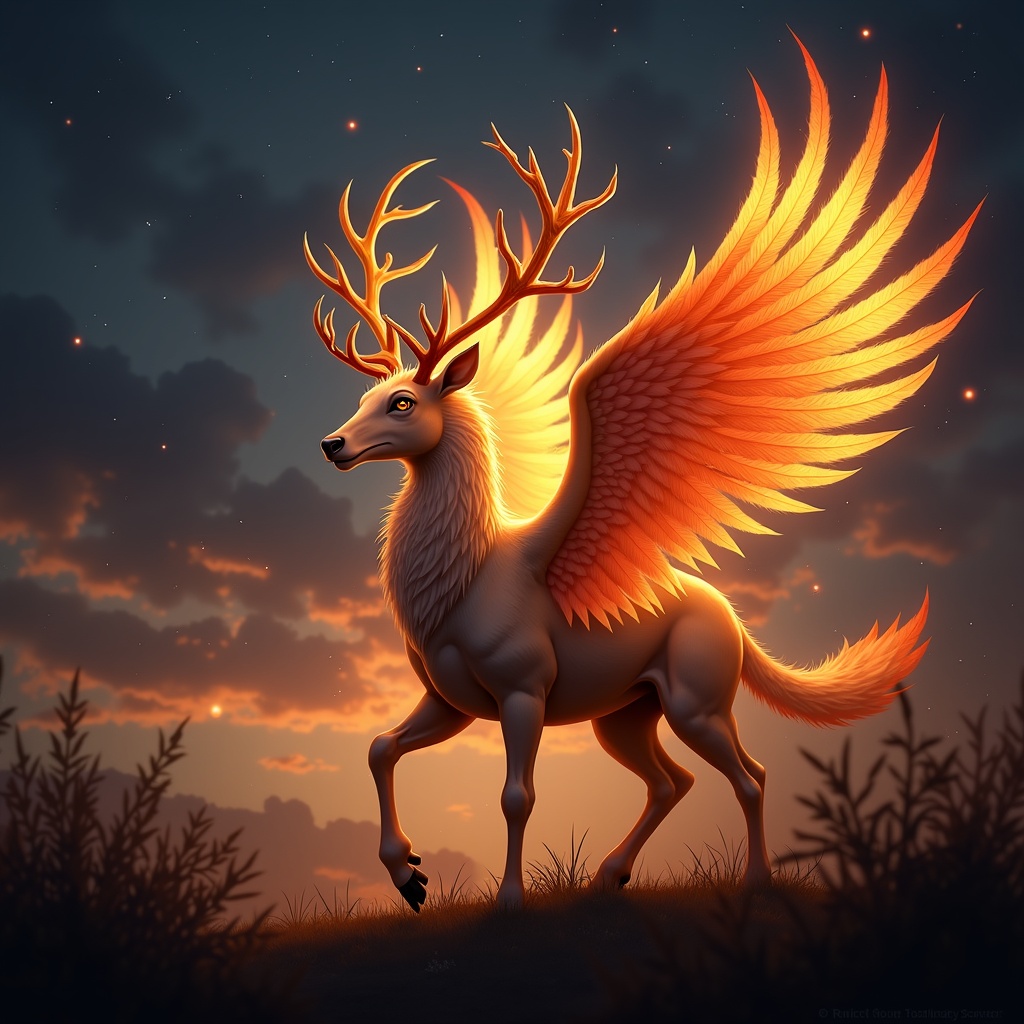 In a realm where the skies paint themselves in shades of twilight, a wondrous creature exists, merging human intellect with the grace of a stag, the majesty of a phoenix's plumage, and the wisdom of an ancient dragon. Adorned with shimmering feathers that shift through hues of gold and crimson, this being possesses the eyes of an insightful sage, reflecting a deep understanding of the world. Its antlers, glowing softly with an ethereal light, branch out like a living constellation, while its voice, a harmonious blend of song and wind, echoes tales of forgotten times. This creature roams the enchanted forest, bestowing blessings of clarity and courage to those pure of heart, as its very presence weaves a tapestry of wonder and mysticism across the land.