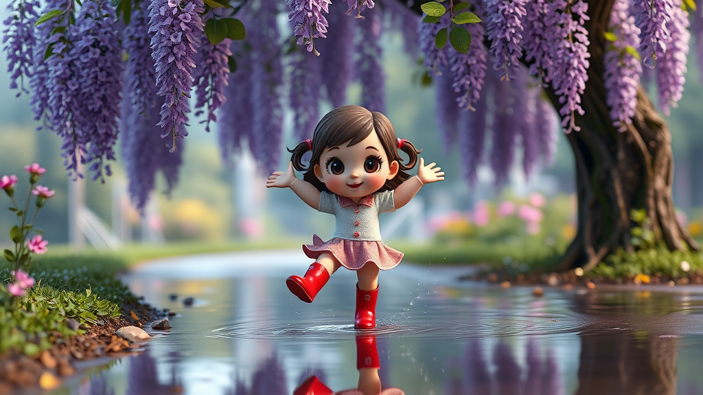 Whimsical 3D octane render featuring an extremely cute chibi-style little girl doll joyfully jumping in a puddle amidst beautiful scenery. She wears bright red rain boots and has big, expressive eyes. The scene is set under a lush wisteria tree with cascading purple blooms. The setting is infused with award-winning hypermaximalist detail and atmospheric volumetric lighting, enhancing the enchanting ambiance.