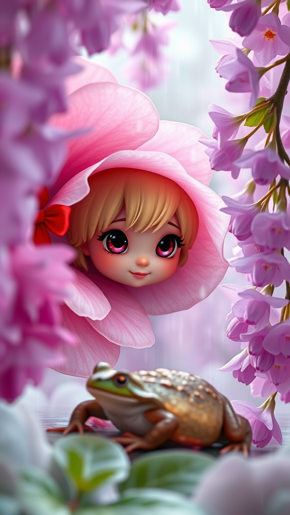 Whimsical adorable character design in a 3D octane render featuring a chibi, irresistibly cute little flower fairy peeking from behind a large blossom during a gentle spring rain. Her big, expressive eyes reveal a playful fear of a nearby toad. The scene is set amidst enchanting wisteria flowers in full bloom, creating a captivating backdrop. Adding to the charm, she wears vibrant red rain boots. The setting is presented in a wide-shot perspective with cinematic lighting that enhances the intricate detailing. The overall composition is award-winning and hypermaximalist, capturing the essence of a magical springtime moment.