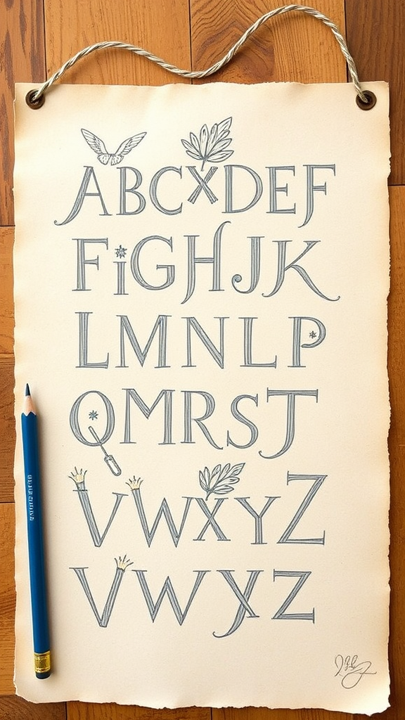 whimsical alphabet design :: on parchment list :: pencil drawing