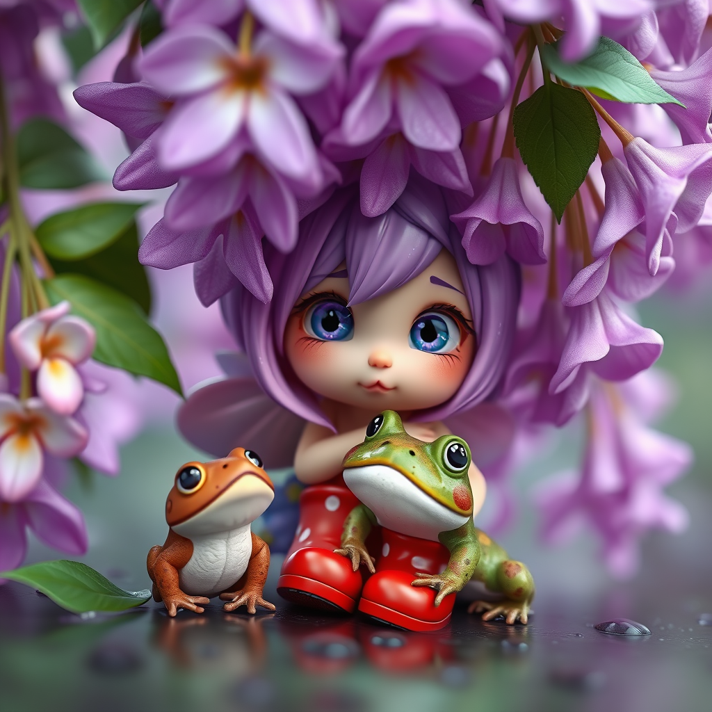 Whimsical and enchanting character design, a 3D octane render features a wide shot of a chibi, irresistibly cute flower fairy nestled behind a vibrant blossom in a gentle rain. Eyes wide with a hint of playful trepidation as she keeps watch on a curious toad nearby. The setting is an exquisite tableau of wisteria in full bloom, capturing the essence of spring. The fairy dons charming red rain boots, her over-sized eyes mirroring the wonder of the season. This award-worthy scene boasts a hypermaximalist aesthetic with cinematic lighting, offering an intricate, detailed portrayal of an adorable, fairytale moment.