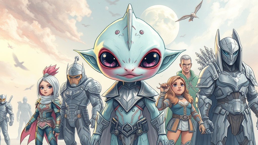 Whimsical baby alien creature, cbzbb influence, intricately detailed, fantasy realm, dreamlike and surreal atmosphere, irresistibly cute, artstation trending style, pencil sketch with a quirky twist, whimsical photo effect, playful cartoon vibe, diverse characters including heroic figures, captivating woman and courageous man, ensemble of fascinating people, iconic hero elements like futuristic armor, innocent baby charm, anime-inspired aesthetics.