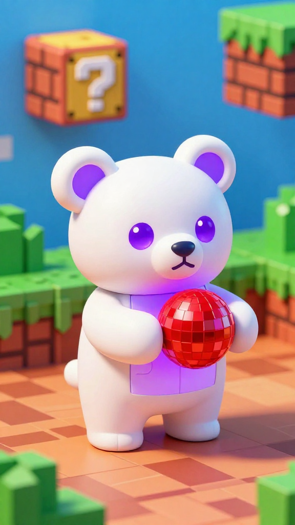 A cute, stylized white bear character with glowing purple eyes holds a shiny red disco ball in a vibrant pixel art environment. The background features blocky Super Mario Bros. style elements, creating a playful and fantastical mood.