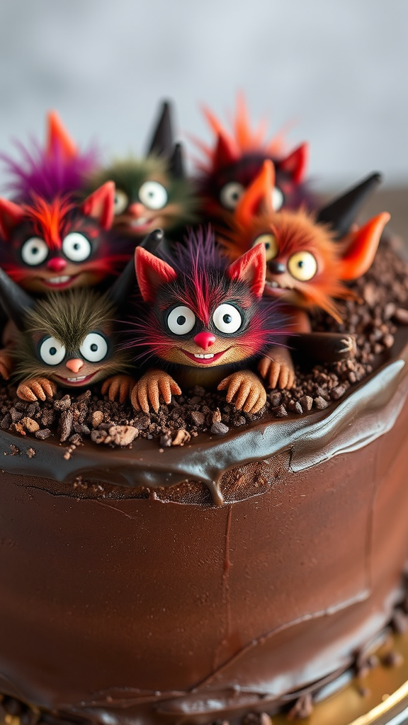 Whimsical cake adorned with mischievous, furry critters peeking out from layers of rich chocolate ganache, their playful grins and glinting eyes capturing the essence of a quirky creature feature, while vibrant sugar spikes and deliciously dark frosting evoke a sense of fun and mystery, inviting guests to indulge in a slice of cinematic whimsy.