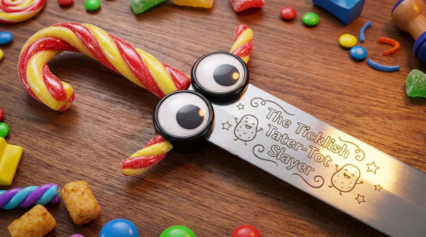 A close-up view of a playful sword featuring a red and yellow candy cane hilt and oversized googly eyes on the crossguard. The gleaming blade is engraved with 'The Ticklish Tater-Tot Slayer' and surrounded by colorful candies on a wooden surface, creating a fun and imaginative scene.