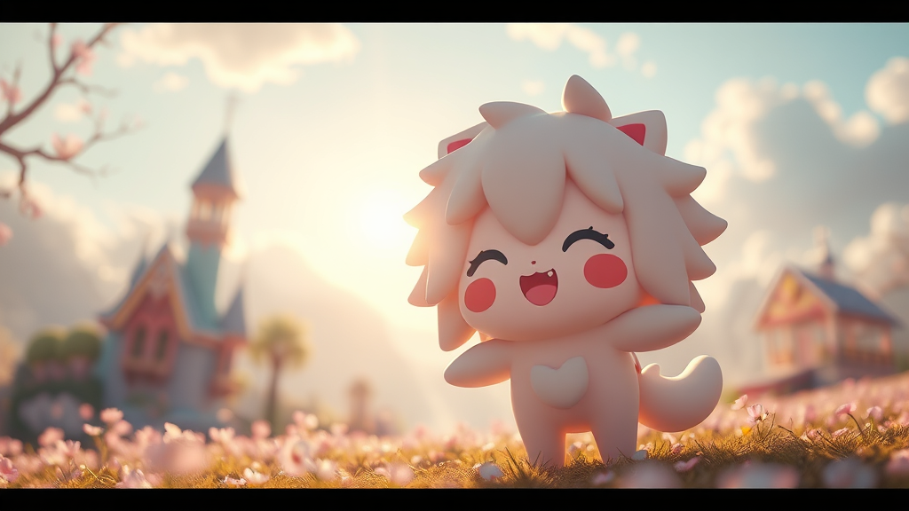 Whimsical Capture, a charming anime mascot melting into delightful, pastel shades, merging seamlessly into a gentle, pastel spectrum, radiating joy and happiness, bathed in gentle, warm light, inspired by Bryan Hitch, low angle, engaging the viewer, subtle lens flare, set against an enchanting fairytale landscape in the backdrop --ar 2:3 --niji 5.