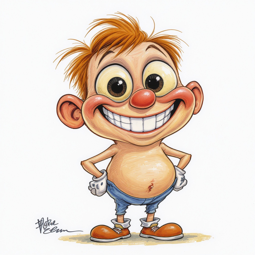 Whimsical caricature illustration of a children's comic book character, featuring outrageously oversized eyes and a comically exaggerated smile, with playful proportions and vibrant colors, in a style that blends humor and charm --ar 1:2 --stylize 750