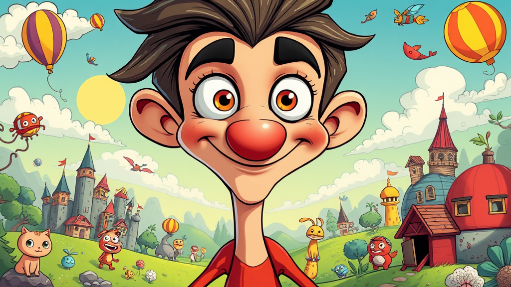whimsical cartoon portrait of a playful comic book hero, delightfully oversized eyes and comically large nose, vibrant colors and expressive gestures, tall and lanky figure with exaggerated limbs, set in a fantastical world full of quirky creatures and imaginative landscapes, --ar 1:2 --stylize 750