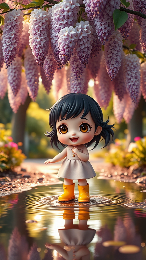 Whimsical character design 3D octane render, chibi extremely cute little girl doll joyfully splashes in puddle, enchanting surroundings, beneath a lush wisteria tree, wearing vibrant yellow rain boots, expressive big eyes, visually captivating, hypermaximalist style, octane render, soft volumetric lighting, intricate detailing, set in a serene garden with warm sun rays filtering through the branches.