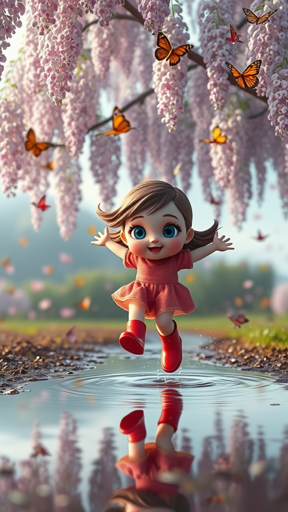 Whimsical character design 3d octane render wide shot, chibi extremely adorable young girl doll joyfully jumps in a puddle, stunning landscape, beneath a blooming wisteria tree, vibrant red rain boots, large captivating eyes, prize-worthy, hypermaximalist, octane render, ethereal volumetric lighting, intricate detailing, surrounded by a chorus of colorful butterflies dancing in the air.