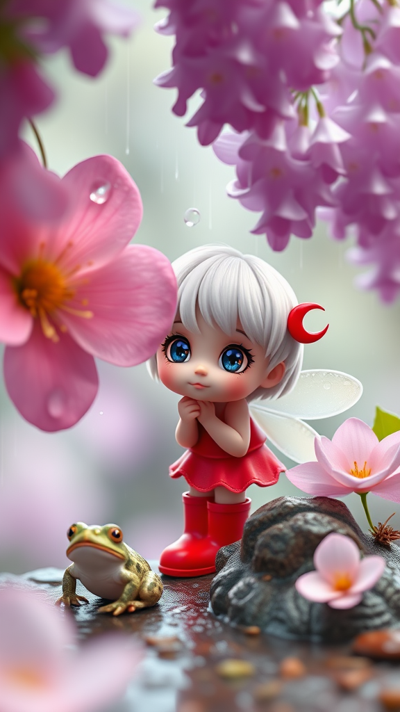 Whimsical charming character design in 3D Octane render, wide shot; an extraordinarily cute chibi flower fairy peeks timidly from behind a blossom as raindrops gently fall. The scene captures her apprehension of a nearby toad amidst enchanting scenery featuring wisteria in full bloom. It's spring, and she sports bright red rain boots with sparkling big eyes full of wonder. Award-winning creation, a vision of hypermaximalist detail with cinematic lighting, each element intricately rendered to bring this magical moment to life.