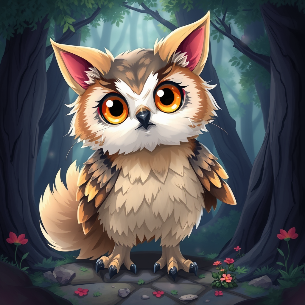 Whimsical creature blending features of an owl and a cat, showcasing an enchanting owl cat concept, exuding cuteness and charm in a full body portrait. Styled in anime-inspired 2D painting with a dynamic pose capturing its playful essence. The artwork emphasizes expressive lines and vibrant colors, presenting the owl cat with large, curious eyes and a fluffy tail, nestled within a magical forest setting, maintaining an air of mystery and wonder. Opulent feathers seamlessly merge with soft fur, reflecting a harmonious balance between its avian and feline traits.