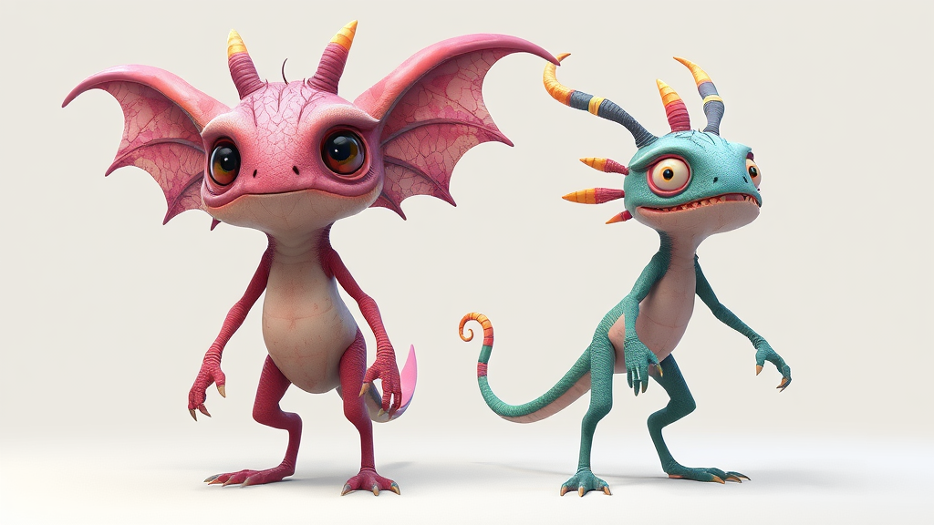 Whimsical creature designs with stylized anatomy and fantastical features, rendered in high-quality digital art with a focus on creative expression, colorful palettes, and intricate details. Simple and plain backgrounds provide a subtle contrast to the vibrant and playful creatures. Emphasis is placed on unique and award-winning designs created through advanced software such as Adobe Photoshop, 3D Studio Max, and V-Ray. The subject matter involves deformed or irregularly shaped creatures with possible fantastical or magical elements, showcasing creative liberties taken with traditional anatomical forms. Flat or 2D illustrations are less emphasized in favor of complex, dimensionally rendered species, suggesting a focus on 3D rendering techniques. Adobe Photoshop's layers and effects tools, 3D Studio Max's polygon modeling capabilities, and V-Ray's real-time rendering technology might be used to achieve a precise balance of bright colors, rich textures, and airy lightning effects.
