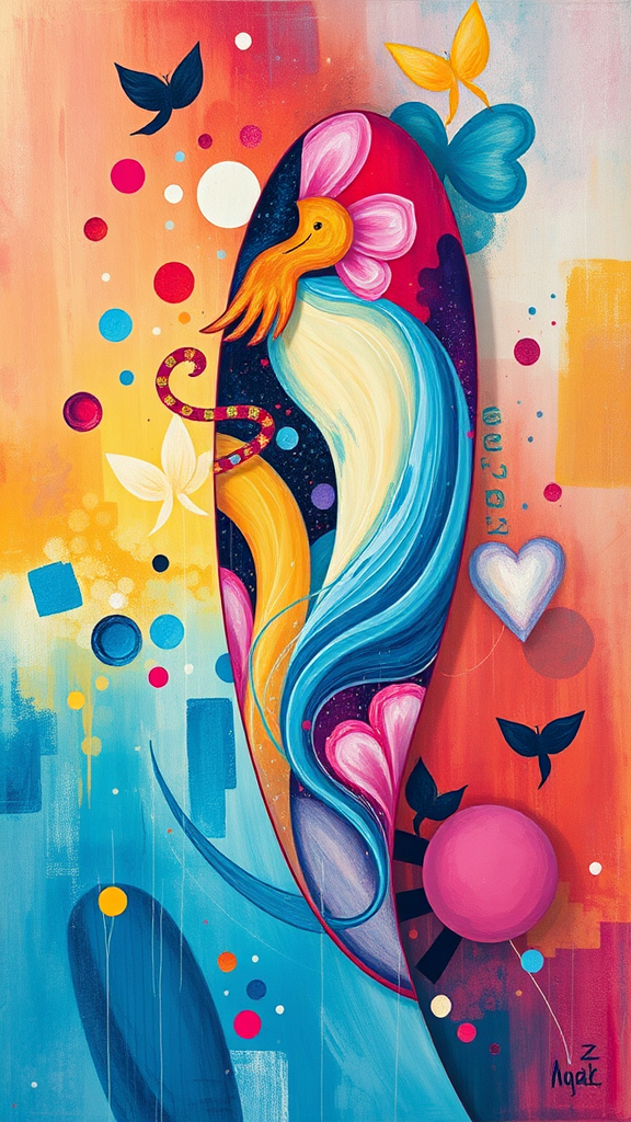 Whimsical curiosity, dreamlike ambiance, in the essence of abstract artistry with an elongated form, infused with imaginative flair and vivid hues that dance across the canvas, evoking the ethereal.