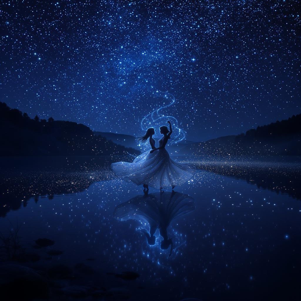 Whimsical dance of twilight whispers, where ethereal silhouettes twirl amidst a canvas of stars, casting enchanting reflections upon a tranquil midnight lake. The scene embodies a delicate harmony of shadow and light, infused with a serene mystique and an air of gentle mystery, adorned with shimmering celestial patterns against the backdrop of a vast night sky.