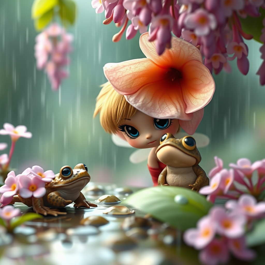 Whimsical delightful character design 3D octane render, wide shot, chibi enchanting tiny flower fairy peeking from behind a blossom in a gentle rain, nervously eyeing a curious toad, surrounded by stunning scenery with cascading wisteria blooms, spring atmosphere, wearing vibrant red rain boots, large expressive eyes, prize-winning, hypermaximalist, octane render, cinematic lighting, intricate details --ar 9:16 --s 1000.