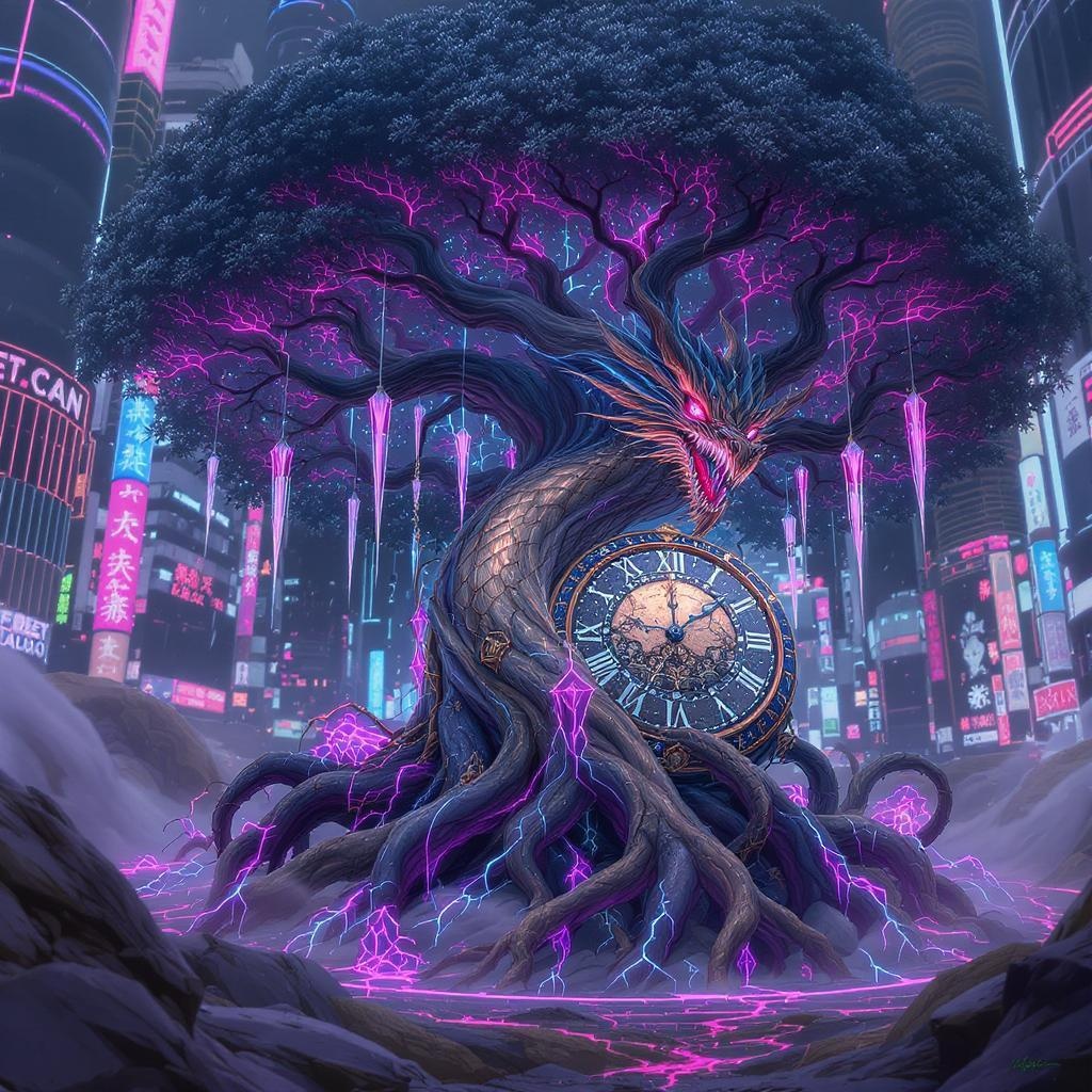 Whimsical dragon tree roots entwine a mystical clock, radiating an aura of enchantment. These intricate roots pulsate with a cyberpunk glow, casting neon hues in the dim light. The clock ticks rhythmically, a fusion of ancient magic and futuristic technology, set against a backdrop of vibrant urban neon.