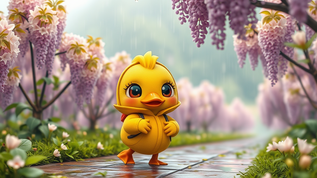 Whimsical enchanting character design, 3D octane render, wide shot, immensely cute chibi little duck embarking on a journey in the rain, stunning landscape, wisteria blossoms, vibrant springtime, bright yellow raincoat, oversized curious eyes, award-winning charm, hypermaximalist, cinematic illumination, intricate detailing, lush greenery, playful spirit, warm ambiance, octane render, --ar 16:9 --s 1000 --chaos 30.