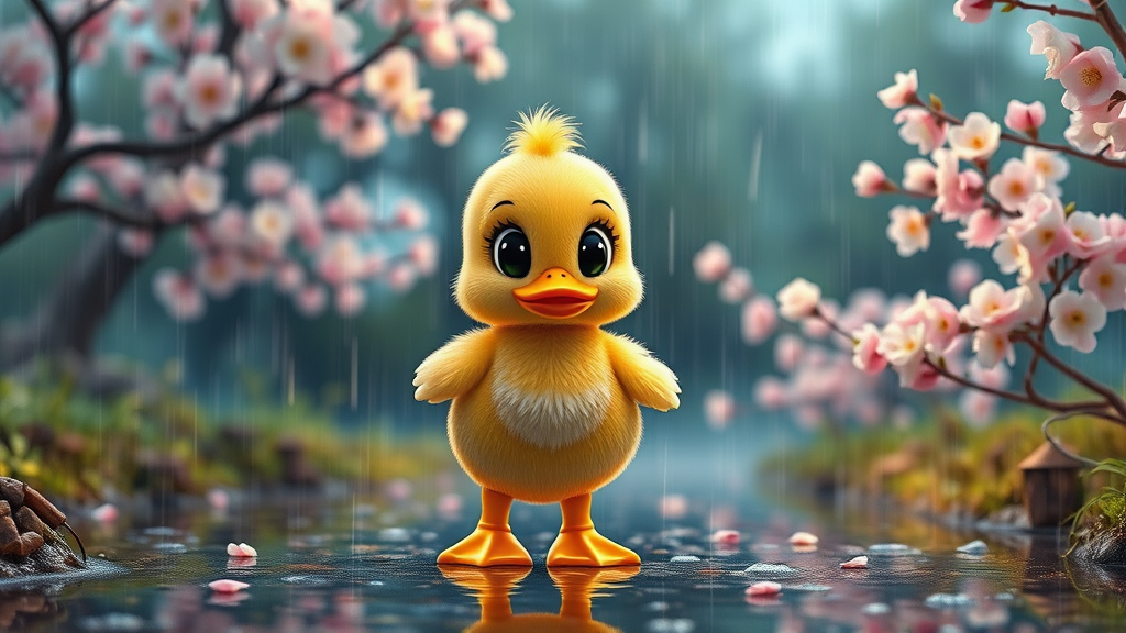 Whimsical enchanting character design 3D octane render, wide shot, chibi irresistibly cute little duck embarks on a thrilling adventure in a gentle rain, surrounded by stunning scenery with blooming cherry blossoms, fresh spring atmosphere, wearing bright yellow rain boots, sparkling big eyes, critically acclaimed, ultra-detailed, hypermaximalist style, octane render, cinematic lighting with an ethereal glow, highly detailed environment reflecting the beauty of nature.