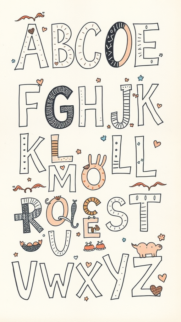 Whimsical hand-drawn alphabet design, detailed letters on paper, playful sketching with unique embellishments and character.