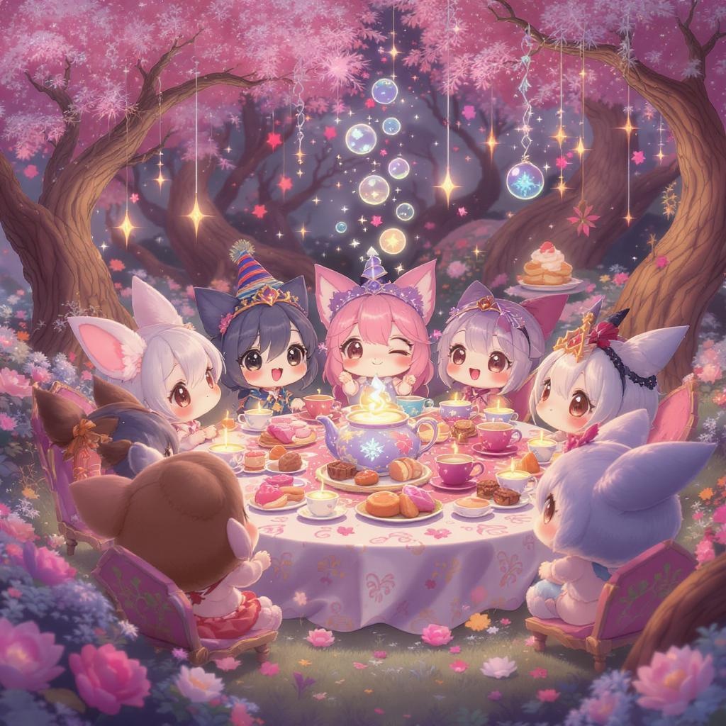 View this AI-generated image featuring whimsical high quality chibi style enchanted tea gathering delightful joyful vivid and bursting with color. Created using advanced AI technology, this image showcases fantasy elements. Perfect for creative projects, digital art, inspiration.