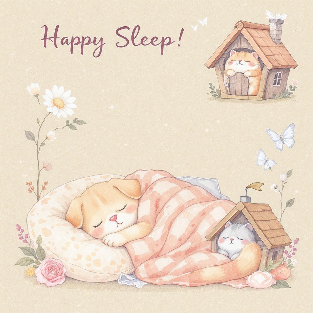Whimsical illustration capturing cute pets in slumber, evoking serenity and mindfulness; watercolor artistry with a soft pastel palette against a muted khaki backdrop.