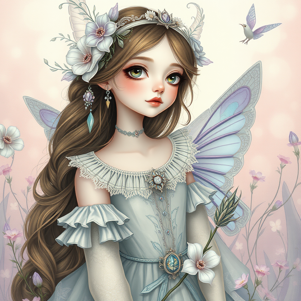 Whimsical maiden, adorned in ethereal attire, surrounded by a dreamy landscape of soft pastel hues, her presence exudes an enchanting aura, with delicate features and imaginative fantasy elements that captivate the senses.