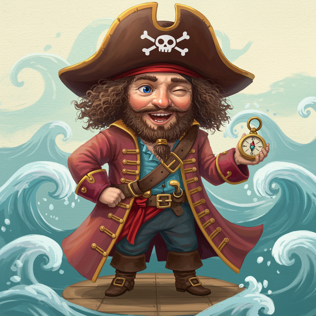 Whimsical miniature pirate Captain with tousled hair, adorned in a vibrant ensemble of oversized hat and flowing coat, playful twinkle in his eye, clutching a tiny compass, standing on a tiny ship deck, surrounded by a backdrop of playful sea waves, mischievous spirit, cartoon-style illustration, adventure-ready yet endearing persona.