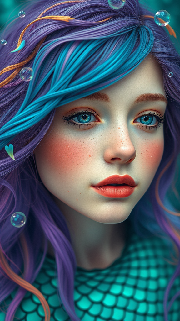 Whimsical portrait of an ethereal woman with a mermaid-like appearance, presenting a fair complexion and youthful, wide-eyed features with delicate freckles sprinkled across her nose and cheeks. Her vibrant hair, in a mesmerizing blend of purple, teal, orange, and blue, seems to defy gravity and morphs gracefully into tendrils and aquatic plants, crafting an enchanting underwater illusion. Tiny bubbles drift around her head, enhancing the aquatic theme. Her attire resembles shimmering fish scales, glowing in vivid teal and green hues. The overall effect is a serene, otherworldly underwater being lost in quiet contemplation, exuding an aura of mystery and grace.