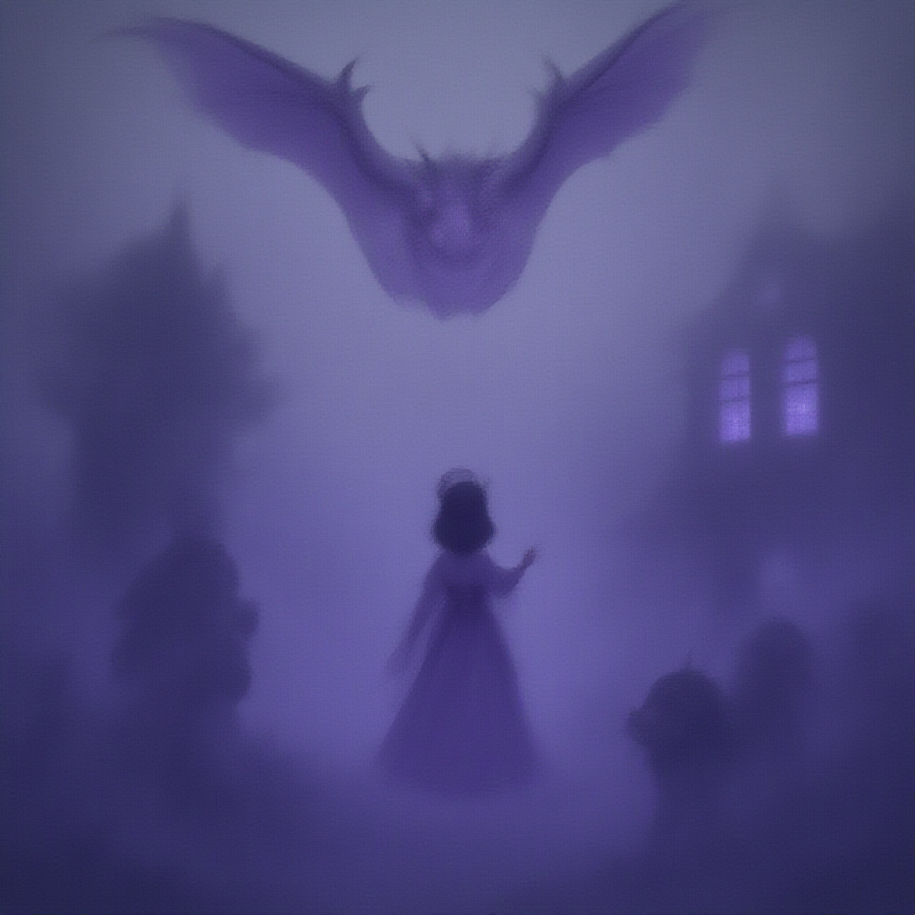 Whimsical scene in grayscale with vibrant purple accents featuring iconic characters from Spirited Away: Chihiro stands amidst the mist, her dress gently fluttering, while Haku hovers in dragon form above, his scales shimmering with faint lavender highlights; No-Face linger nearby, shadowed but touched with a soft amethyst glow; in the distance, the bathhouse rises, its windows illuminated with a subtle lilac hue, casting a magical aura over the ethereal landscape.