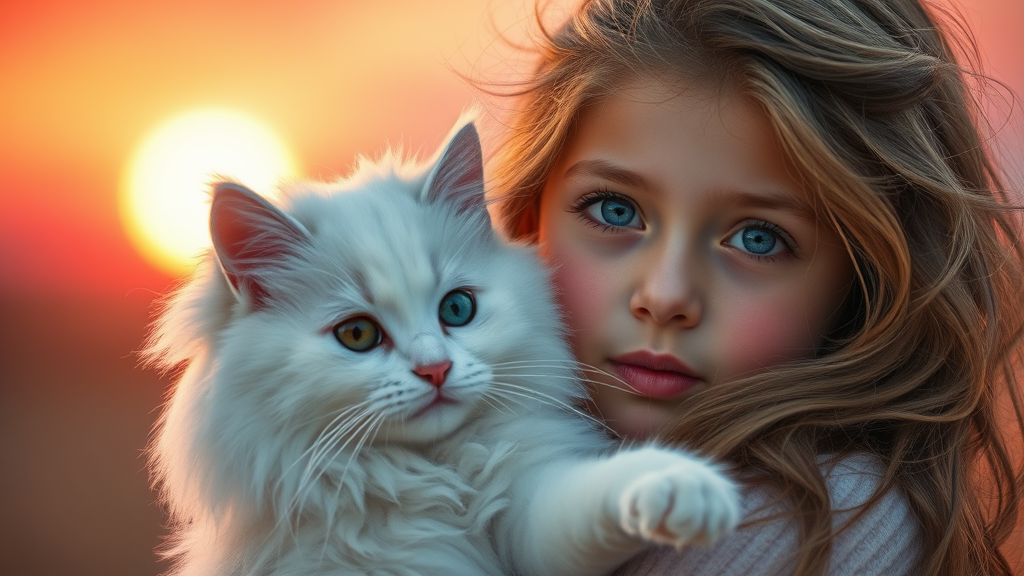 Whimsical scene of a young girl with a fluffy white cat, bathed in a pink sunrise glow, details capturing their expressive eyes and flowing hair, cinematic depth and clarity with vibrant colors and high definition, creating an enchanting and dreamlike atmosphere.